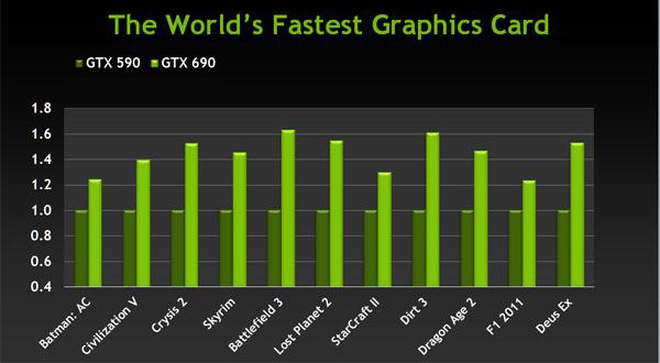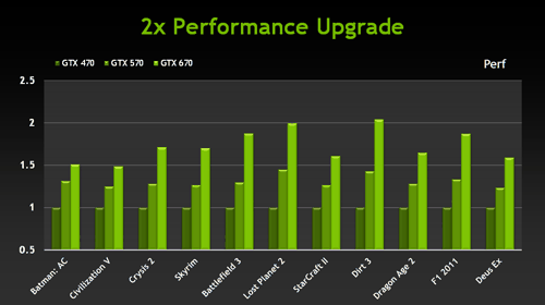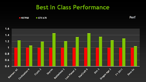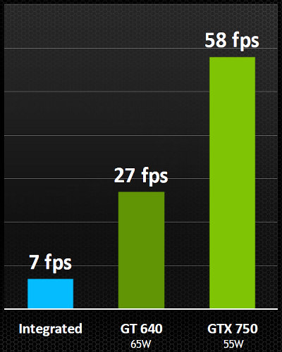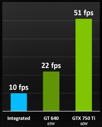 Иными словами, GTX 750 Ti будет иметь явное преимущество в играх, которым важна высокая скорость текстурирования и математическая производительность (а это — большинство игр), а в случае, если упор будет в ПСП или блоки ROP, то преимущества почти не будет или новинка даже будет немного проигрывать своему предшественнику. Давайте сначала посмотрим, что получилось в тестах у самой NVIDIA.