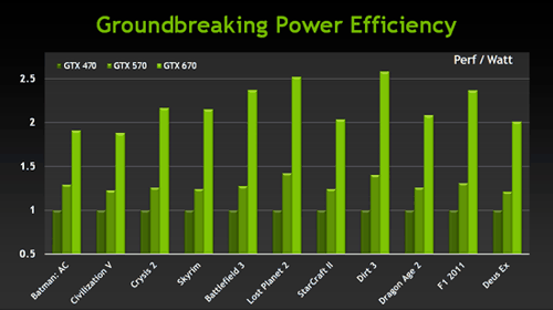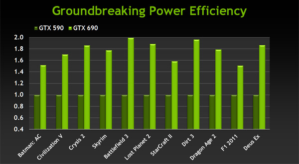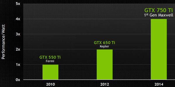 Большая эффективность означает меньшее потребление энергии, то есть лучшую энергоэффективность (соотношение производительности и потребления энергии) у первого чипа архитектуры Maxwell, и модель GeForce GTX 750 Ti по этому параметру вдвое лучше GTX 650 Ti и до четырёх раз обгоняет по энергоэффективности модель GTX 550 Ti, основанную на видеочипе семейства Fermi и выпущенную четыре года назад. Иными словами, если верить цифрам NVIDIA, то они дважды удвоили энергоэффективность своих недорогих решений за прошедшие четыре года. Но самое впечатляющее в том, что они смогли добиться двукратного прироста в эффективности без смены техпроцесса.