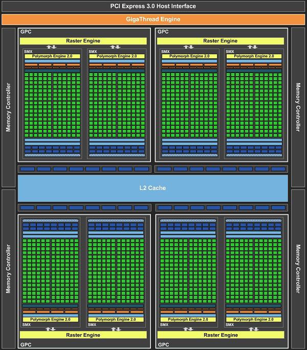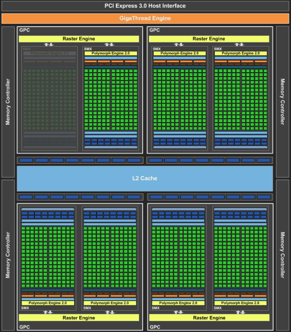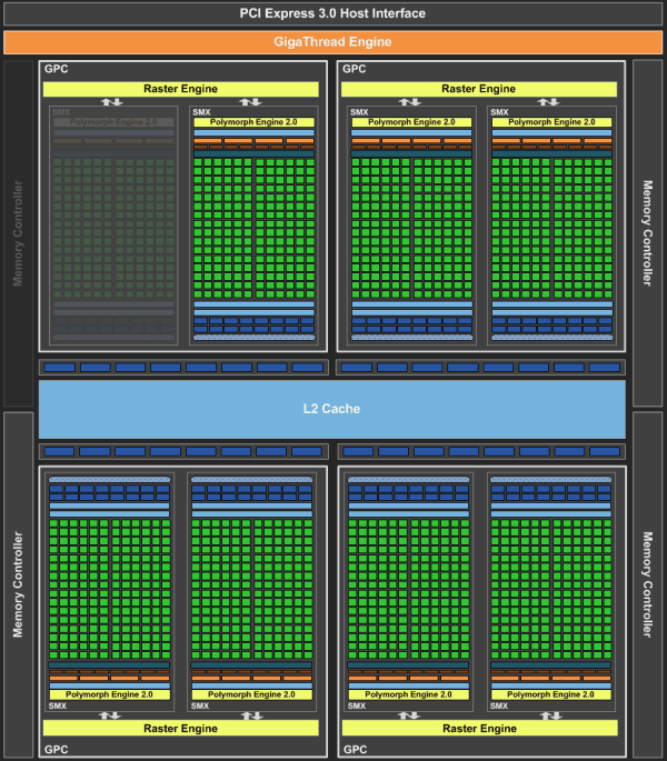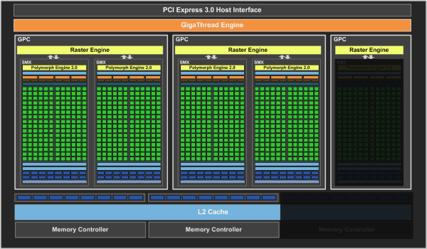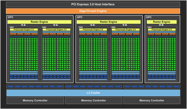 | GeForce GTX 670 | GK104 | 1344/112/32 | 915(980) | 1502(6008) | 2 GDDR5 | 192,3 (256) | 102,5 | 29,3 | 170 |