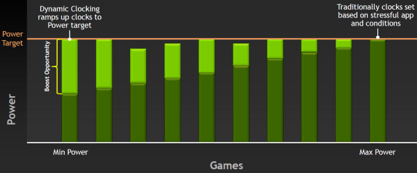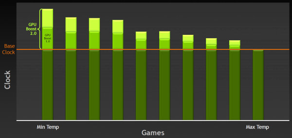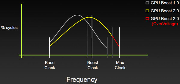 Естественно, что GM107 поддерживает технологию динамического изменения тактовой частоты и напряжения GPU Boost 2.0, обеспечивающую максимально возможную 3D-производительность в определённых условиях (напряжение, температура, потребление) при сохранении минимального уровня частоты, который гарантируется при любых номинальных условиях. Базовая тактовая частота для видеочипа в моделях GeForce GTX 750 Ti и GTX 750 равна 1020 МГц, а турбо-частота (средняя повышенная частота в нескольких играх и приложениях) — 1085 МГц. Естественно, по природе своей турбо-частота в каждой игре и при разных условиях может отличаться, есть лишь некое среднее значение.