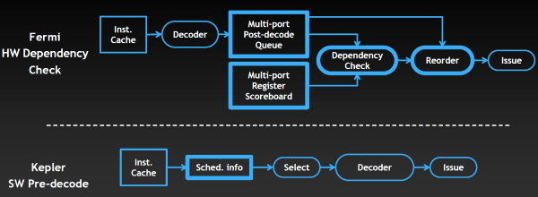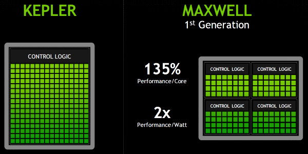 В чипах Kepler, каждый мультипроцессор SMX содержит управляющую логику, которая распределяет и планирует работу и обмен данными для 192 вычислительных ядер, поэтому управляющий блок довольно сложен сам по себе. В архитектуре Maxwell было принято решение разделить мультипроцессор SMM на четыре вычислительных блока, каждый из которых содержит собственный блок управления, обслуживающий лишь 32 ядра и намного более простой. Таким образом проектировщики Maxwell добились разделения одной сложной задачи планирования и управления на несколько заметно более простых, а часть управляющей блоками работы при этом делается программно, при помощи компилятора.