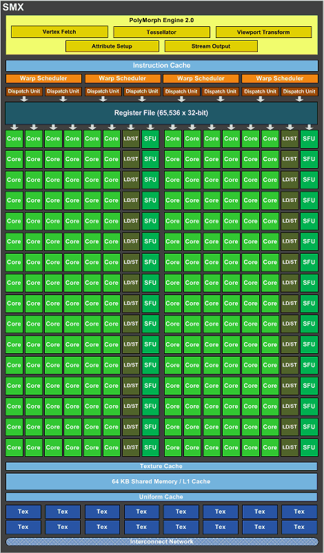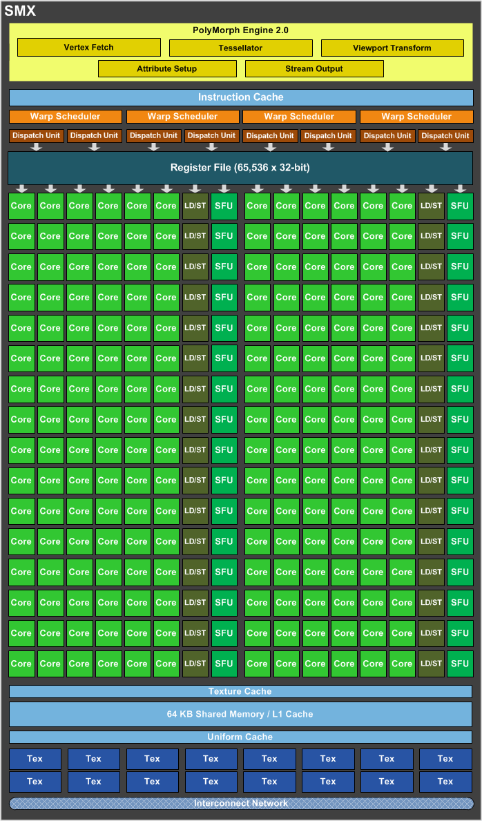 Общими в SMM остались лишь текстурные модули и FP64-блоки, а FP32-блоки, блоки специальных инструкций (special function unit — SFU) и блоки загрузки-сохранения (load/store unit — LSU) выделены для каждого раздела. Такое решение хорошо с точки зрения эффективности, ведь общие ресурсы хороши только тогда, когда они загружены работой, а при её (частичном) отсутствии они просто занимают место на чипе и потребляют энергию. Не говоря о том, что соединения между ними также дорого обходятся с точки зрения площади чипа и потребления, так как требуется дополнительная работа по планированию и координации работы всех блоков.