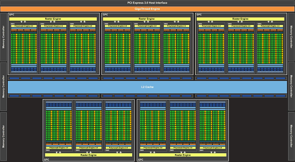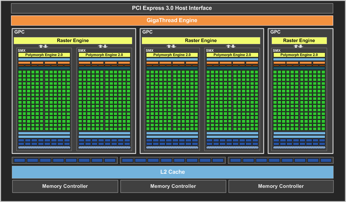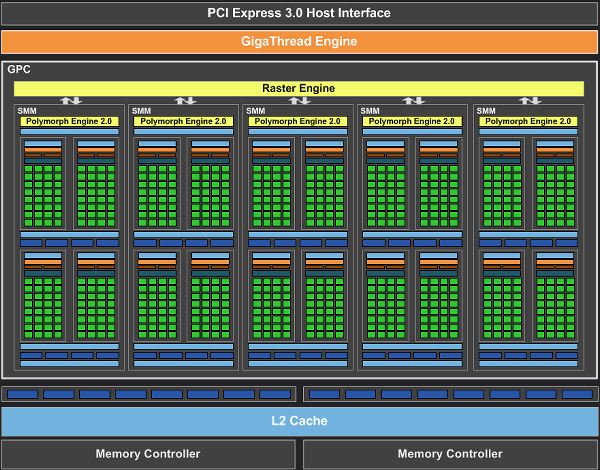 Самое важное, что новый дизайн мультипроцессоров обеспечил значительно меньший размер, занимаемый блоком на кристалле, при достижении около 90% производительности мультипроцессора архитектуры Kepler. А меньшая площадь мультипроцессора означает, что на тот же размер чипа можно поместить большее количество мультипроцессоров. Если сравнивать схожие по позиционированию чипы GK107 и GM107, то общее количество мультипроцессоров в GM107 равно пяти, в отличие от двух SM в Kepler. Если говорить о теоретической производительности, то это означает на четверть большую текстурную производительность, в 1.7 раз большее количество вычислительных ядер и примерно в 2.3 раза большую вычислительную производительность по оценке NVIDIA.