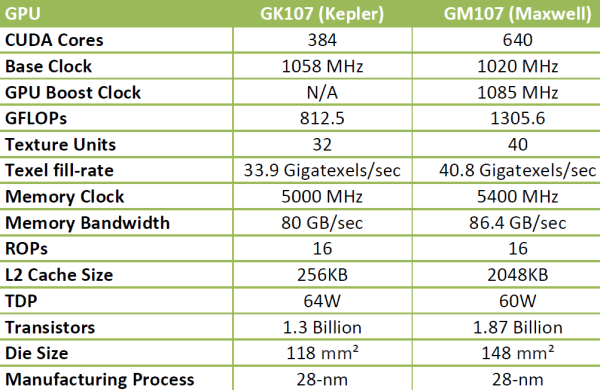 Если сравнивать GM107 с GK107 по топовым решениям, как это делает NVIDIA, то хорошо видно, что у чипа архитектуры Maxwell аж на 60% выше математическая производительность за счёт выросшего количества ALU, на 20% выросла скорость текстурных выборок и фильтрации. Зато пропускная способность видеопамяти повысилась лишь на 10% (86.4 ГБ/с против 80 ГБ/с), а производительность блоков ROP так и вовсе стала немного ниже, за счёт меньшей базовой тактовой частоты и одинакового количества соответствующих блоков, что может сказаться в некоторых условиях.