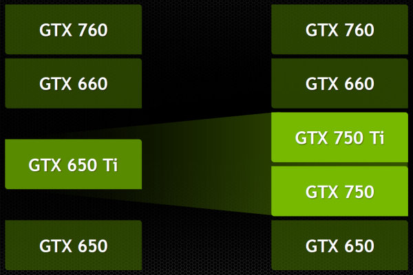 GeForce GTX 750 Ti недостаточно быстра для того, чтобы заменить GeForce GTX 660, но она намного быстрее обычной GTX 650 (не Ti), поэтому новинки замещают решения GTX 650 Ti, в том числе и модификацию Boost, выполненные на урезанных GK106. Таким образом NVIDIA значительно снизила себестоимость данных продуктов, ведь новые платы серии GTX 750 обещают быть не хуже тех, которые они заменяют, при гораздо меньшей сложности GPU и печатных плат.