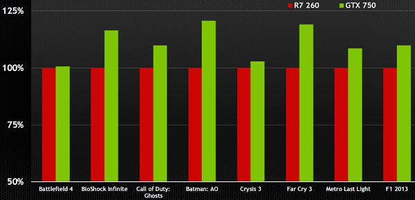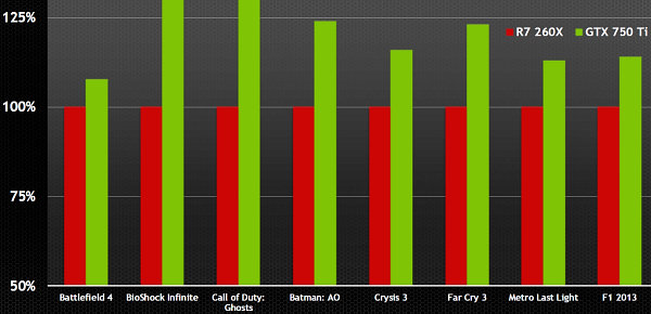 Все тесты проводились на системе с Intel Core i7-4770K, в разрешении 1920×1080 пикселей и при средних настройках. В таких условиях, по данным NVIDIA, их GeForce GTX 750 Ti в большинстве современных игр действительно обеспечивает на 10-15% большую производительность, чем плата конкурента, даже без скидки на меньшее энергопотребление (не забываем, что эти данные — от заинтересованной стороны). Ну а если рассматривать соотношение скорости рендеринга и потребления энергии, то GTX 750 Ti абсолютно точно станет победителем, ведь GeForce GTX 750 Ti потребляет 60 Вт, а Radeon R7 260X — 115 Вт, что почти вдвое больше. Впрочем, зато плата NVIDIA имеет более высокую цену, а у AMD есть ещё одна новая модель — Radeon R7 265, а с ней NVIDIA сравнить новинку не успела.