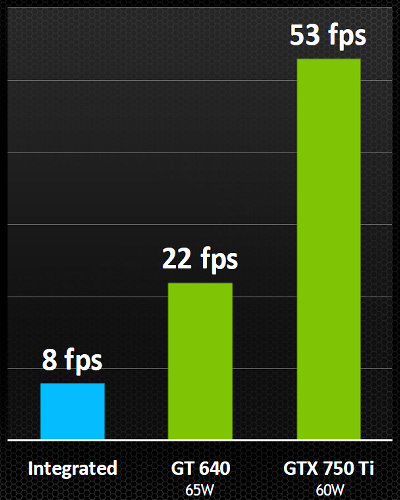 Далее, NVIDIA уверяет, что GeForce GTX 750 Ti обеспечит компактные системы мощным видеоядром, достаточным для игры в разрешении 1920×1080. Это делает новинку и весьма удачным бюджетным вариантом для апгрейда видеоподсистемы для устаревших ПК, не имеющих возможности обеспечения дополнительного питания и обходящейся 300-ваттным БП. Также выпущенная недавно модель GeForce GTX 750 Ti должна отлично подходить для мультимедийных центров и домашних кинотеатров, имеющих жёсткие ограничения по потреблению энергии.