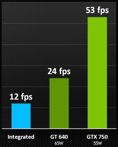 Те же самые решения сравнивались на той же системе в игре Batman: Arkham Origins при разрешении 1920×1080, также с использованием полноэкранного сглаживания уровня 4x и средних настройках качества. В этой игре новая модель GeForce GTX 750 Ti показала более чем 6-кратное превосходство над интегрированной графикой Intel и была на 140% быстрее предшественницы в лице GeForce GT 640, потребляющей даже чуть больше энергии. Так что можно точно сказать, что GeForce GTX 750 Ti — действительно очень неплохой вариант для включения в конфигурацию компактных систем с низким потреблением энергии. Даже при сравнительно невысокой цене решения, вместе с GeForce GTX 750 Ti компактные системы легко могут стать достаточно мощными даже для требовательных игр.