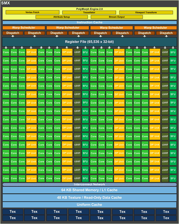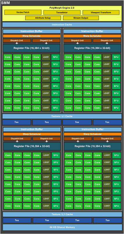 Четыре вычислительных раздела в составе SMM попарно делят между собой по четыре текстурных модуля и текстурную кэш-память, равно как и кэш-память первого уровня (для вычислительных задач), скомбинированные в единый блок. А вот общая (shared) память объёмом в 64 КБ на мультипроцессор выделена в отдельный блок, который делится между всеми четырьмя вычислительными блоками.