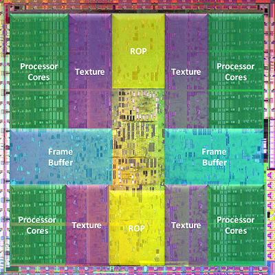 Чтобы было понятнее, какую часть чипа занимают те или иные блоки в GPU, приведем фотографию чипа GT200 с указанными площадями соответствующих исполнительных блоков.