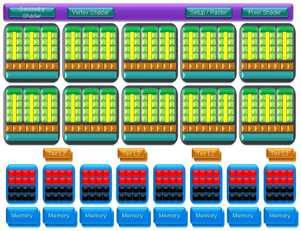 Ещё первое поколение унифицированных чипов NVIDIA (серии GeForce 8 и 9) имело в своей основе масштабируемый массив процессоров. Второе поколение унифицированной архитектуры, которое мы сегодня рассматриваем, также имеет подобную основу, но улучшенную и переработанную. Массив содержит определённое количество блоков TPC (Texture Processing Clusters), каждый из которых включает несколько потоковых мультипроцессоров (streaming multiprocessors SM). А каждый из SM, в свою очередь, состоит из нескольких потоковых процессоров (SP), которые чаще всего считаются и сравниваются в маркетинговых материалах. Потоковые мультипроцессоры также содержат блоки выборки и фильтрации текстурных данных, используемых как в графических задачах, так и в некоторых расчётных.