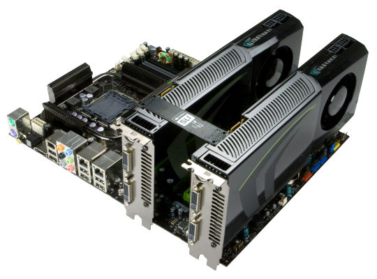 Между двумя GPU, как и в случае всех предыдущих решений на основе пары видеочипов, установлен чип-коммутатор, который связывает между собой графические процессоры. В данном случае применён чип nForce 200 (BR-04), поддерживающий нужное количество линий на три порта PCI-E с поддержкой версии 2.0. Для связи с каждым чипом отводится по 16 линий PCI-E 2.0, и столько же для передачи данных между системной платой и видеокартой.