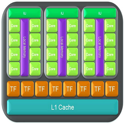 Ничего особенно нового, очевидны только количественные изменения и добавленный FP64. К слову, каждый TCP содержит локальную память объёмом 16 Кб, которая разделяется между всеми потоковыми процессорами в блоке.
