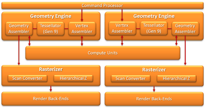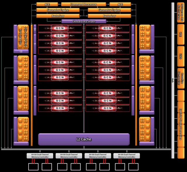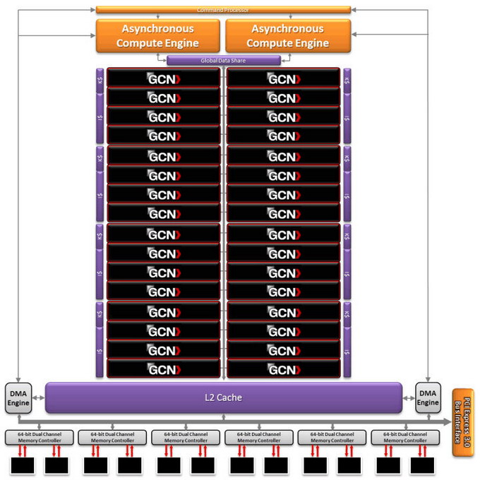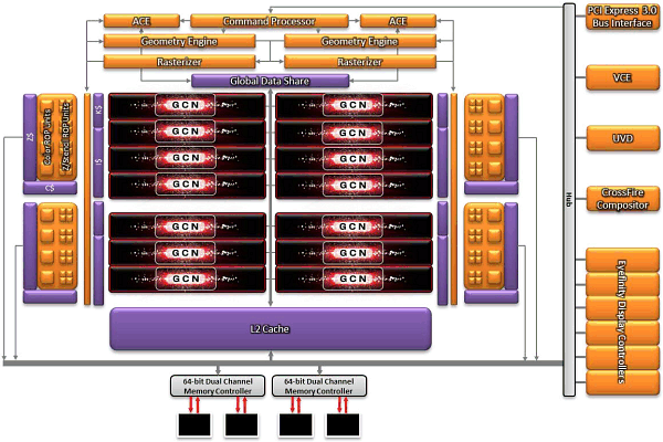 Как известно, базовым блоком архитектуры является блок GCN, из которых собраны все графические процессоры серии Southern Islands. Вычислительный блок GCN разделён на подразделы, каждый из которых работает над своим потоком команд. Блоки GCN имеют выделенное локальное хранилище данных для объёмом 64 КБ для обмена данными или расширения локального регистрового стека. Также блок имеет кэш-память первого уровня с возможностью чтения и записи и полноценный текстурный конвейер с блоками выборки и фильтрации. Каждый из имеющихся блоков GCN способен заниматься планированием и распределением команд сам, и один вычислительный блок может исполнять по несколько независимых потоков команд. Посмотрим на блок-схему нового чипа: