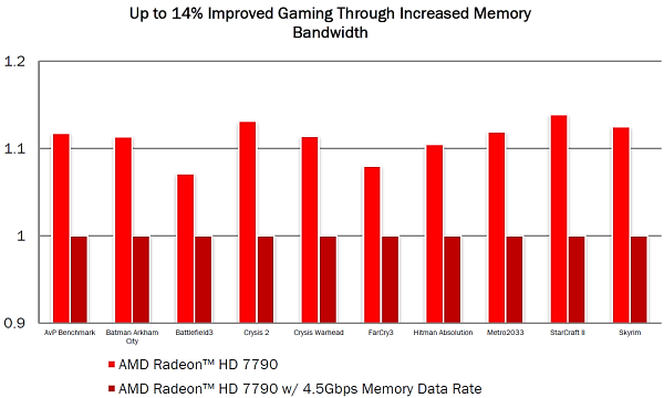 Зато частота работы видеопамяти у новинки значительно выше. Если HD 7770 имел сравнительно невысокую частоту памяти в 4.5 ГГц, то на HD 7790 ставят быструю GDDR5-память, работающую на 6 ГГц, что обеспечивает на треть большую пропускную способность. Увеличенная на 33% полоса пропускания видеопамяти по сравнению с моделями подсемейства Radeon HD 7700 привела к понятному увеличению производительности в играх. AMD приводит такую диаграмму, сравнивая частоту кадров на HD 7790 с памятью, работающей на 4.5 и 6.0 ГГц: