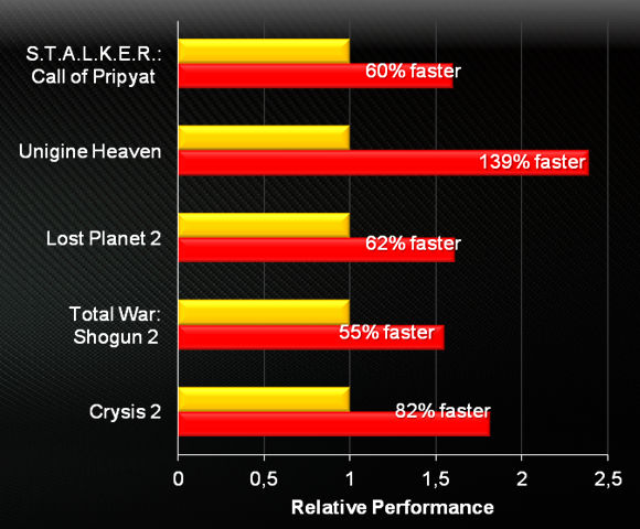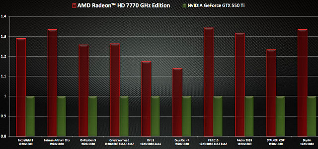 Ну а как же самое главное — производительность в играх? Первые прикидки о скорости рендеринга всегда можно сделать из презентаций производителя. Компания AMD считает, что Radeon HD 7770 располагается где-то посередине между GeForce GTX 560 и GeForce GTX 550 Ti, соответственно и сравнивает её в своих материалах со второй моделью конкурента.