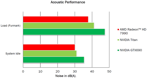 Шумность системы охлаждения и обеспечиваемая температура для графических процессоров являются одними из важнейших потребительских характеристик для любой видеокарты, в том числе и топового решения, предназначенного для энтузиастов. Слишком громкая или неэффективная система охлаждения будет расценена покупателями как менее выгодное приобретение при прочих (примерно) равных показателях. Так что AMD подошла к этому вопрос в случае модели Radeon HD 7990 очень серьёзно, если сравнивать её с другими топовыми решениями, присутствующими на рынке. Рассмотрим акустические характеристики новой системы: