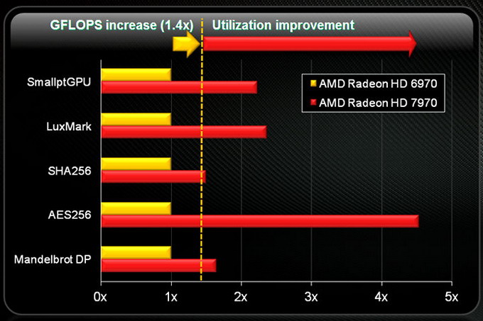 Предыдущие архитектуры GPU компании AMD использовали архитектурные модели VLIW4 и VLIW5, и хотя они достаточно хороши для графических задач, но являются недостаточно эффективными для универсальных вычислений, так как загрузить все исполнительные блоки работой в таких условиях очень непросто. Новая архитектура GCN предлагает столь же большое количество исполнительных блоков, но при скалярном исполнении, которое убирает ограничения и зависимости регистров и инструкций. Переход от архитектуры VLIW к скалярному исполнению даёт заметное упрощение задач по оптимизации кода.