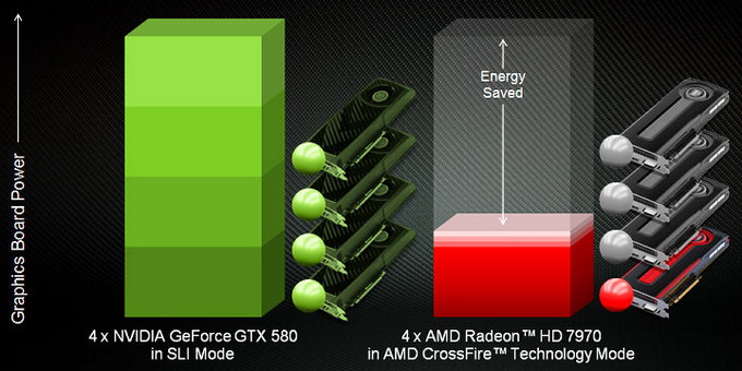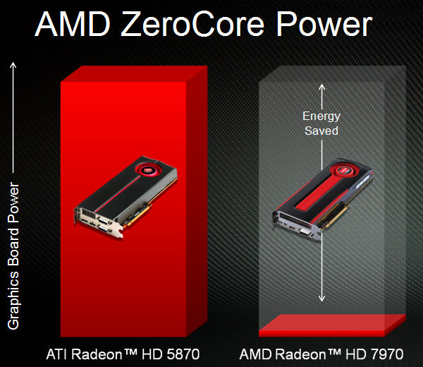 С точки зрения энергопотребления в двухчиповом решении нет ничего нового, но поддержка ранее анонсированной технологии ZeroCore Power тут также есть. Данная технология помогает добиться значительно меньшего потребления энергии в режиме «глубокого простоя» (или «сна») с отключенным устройством отображения. В таком режиме простаивающий GPU практически полностью отключается, и потребляет менее 5% энергии полноценного режима, отключая большинство функциональных блоков. А в случае двухчиповой платы ещё важнее то, что в системе CrossFire при отрисовке двухмерного интерфейса операционной системы все GPU, кроме главного, не работают вовсе. То есть, в случае Radeon HD 7990 один из чипов в 2D-режиме будет погружен в глубокий сон с минимальным потреблением энергии, да и второй может «заснуть» в режиме глубокого простоя ПК.