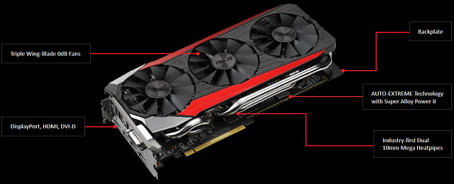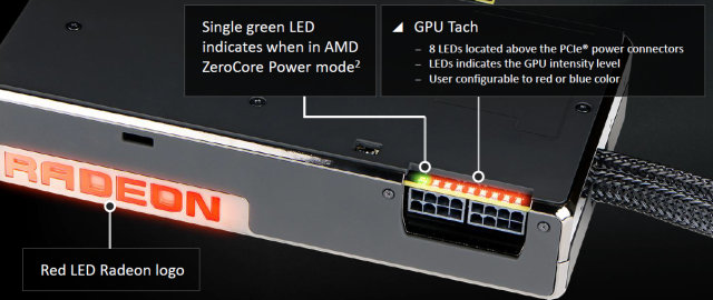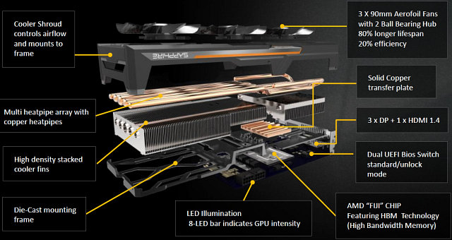 Среди разъемов на плате есть один видеовыход формата HDMI и три DisplayPort. От устаревшего разъема DVI решили избавиться совсем, хотя в Radeon HD 7970 и Radeon R9 290X они ещё были, а иногда и по два. И пользователям старых мониторов с DVI-интерфейсами теперь придется использовать переходники: пассивные, если достаточно Single Link, и более дорогие для Dual Link соединений.