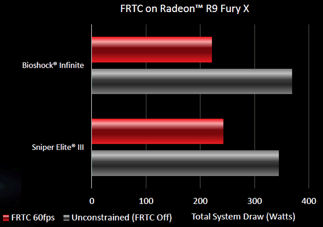 В типичных игровых условиях видеокарта Radeon R9 Fury X потребляет около 275 Вт, но так как она оснащена парой 8-контактных разъемов питания PCI-E, то может получать от блока питания до 375 Вт, то есть, намного больше. С точки зрения интерфейсов ввода-вывода, Radeon R9 Fury X способен выводить информацию на шесть дисплеев (при использовании хаба DisplayPort 1.2 MST), подключенных по разъемам DVI (требуется переходник), HDMI 1.4a и DisplayPort 1.2a.