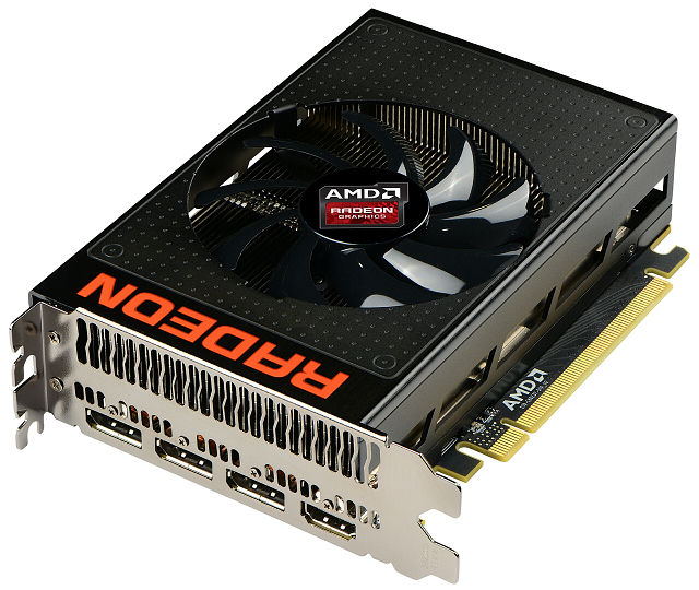 Сама по себе видеокарта невелика по размеру и, как и её предшественница Radeon R7 265, оснащена лишь одним шестиконтактным разъёмом дополнительного питания, что означает уровень энергопотребления порядка 150 Вт. Это значение явно указывает на применение устаревшего GPU, не отличающегося особой энергоэффективностью, ведь конкурирующая видеокарта GeForce GTX 750 Ti с весьма энергоэффективным видеочипом архитектуры Maxwell потребляет всего лишь до 60 Вт.