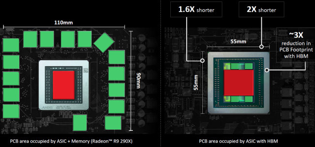 Сама по себе видеокарта очень компактна по размерам — длина печатной платы Radeon R9 Fury X равна всего лишь 7.5 дюймов (около 190 мм), что значительно меньше типичных референсных карт верхнего ценового диапазона. Небольшая плата сочетается с большим радиатором системы водяного охлаждения. Сочетание СВО с HBM-памятью позволило уменьшить физические размеры и число компонентов на плате (в схеме питания, в частности). Можно сравнить площади GPU и RAM на Radeon R9 290X и R9 Fury X:
