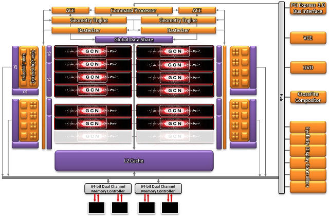 Базовые блоки в Tobago остались без изменений, поэтому можно смело знакомиться со статьёй, посвящённой анонсу давнего флагмана компании Radeon HD 7970, в которой были тщательно описаны все особенности новой архитектуры Graphics Core Next. Как известно, базовым блоком архитектуры является блок GCN, из которых собраны все графические процессоры компании. Вычислительный блок GCN разделён на подразделы, каждый из которых работает над своим потоком команд, они имеют выделенное локальное хранилище данных, кэш-память первого уровня и текстурный конвейер с блоками выборки и фильтрации.