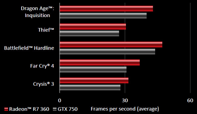 По тестам, проведённым специалистами AMD, их модель Radeon R7 360 оказывается в среднем быстрее GeForce GTX 750 в разрешении 1920×1080 и высоких настройках качества в наборе из пяти популярных игр. Ну и снова обратимся к теме многопользовательских игр, популярных в киберспорте, оценив скорость рендеринга Radeon R7 360 и 370 в таких проектах: