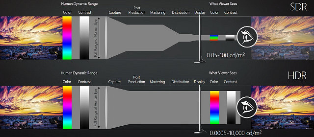Внедрения High Dynamic Range во все стадии конвейера обработки изображения ждут многие энтузиасты качественного изображения. Для того чтобы хоть приблизиться к возможностям человеческого зрения, был введен новый индустриальный стандарт для телевизоров — HDR UHDTV, обеспечивающий диапазон яркости от 0.005 до 10000 нт. Первые HDR-устройства имеют яркость до 600-1200 кд/м2, а ЖК-мониторы с поддержкой High Dynamic Range (HDR) и локальной подсветкой в будущем смогут обеспечить до 2000 нт, а OLED-дисплеи — до 1000 нт, но при идеальном черном цвете и большей контрастности.