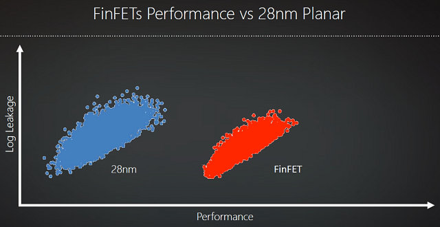 На этой диаграмме видны как большая средняя производительность для FinFET-продуктов, так и меньшие утечки в среднем, и меньший разброс в показателях производительности и величине утечек для разных образцов. Улучшение вариативности этих характеристик для GPU в случае FinFET означает, что можно повысить итоговую частоту для всех продуктов, в то время как для планарных транзисторов приходилось обращать большее внимание на худшие показатели и снижать референсные характеристики для всех конечных продуктов.