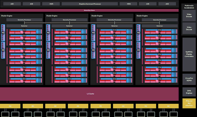 И все же некоторые аппаратные изменения в GPU были внесены. В список улучшений и изменений входит: улучшенная обработка геометрии, поддержка нескольких проекций при рендеринге VR с разным разрешением, обновленный контроллер памяти с улучшенным сжатием данных, модифицированная предвыборка инструкций и улучшенная буферизация, планирование и приоритезация вычислительных задач в асинхронном режиме, поддержка операций над данными в формате FP16/Int16. Рассмотрим схему нового графического процессора (по клику на изображении доступна увеличенная версия иллюстрации):