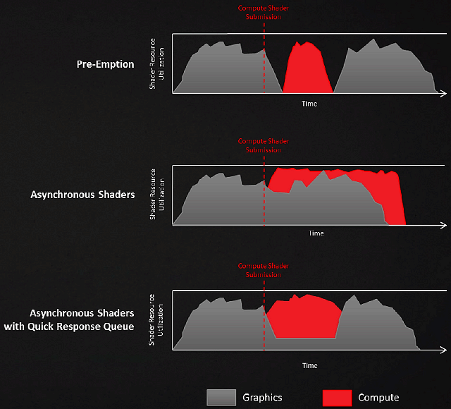 Еще одной возможностью по работе с VR, которая недавно появилась, стало выделение нескольких вычислительных устройств Compute Unit под различные задачи, вроде обработки звука — в таком случае, эти CU будут заниматься исключительно этими задачами, чтобы избежать проблем, связанных с одновременным исполнением различных задач на GPU в реальном времени — это решение обеспечивает немедленное исполнение критичного кода и работает с любыми типами шейдеров, вычислительными или графическими.