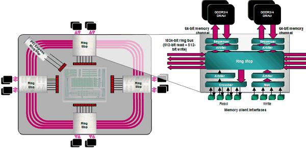 - Двойная 256-битная шина памяти: по четыре контроллера шириной 64 бита, соединенных шиной ring bus