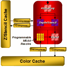 - 4 блока ROP с поддержкой режимов антиалиасинга с возможностью программируемой выборки более чем 16 сэмплов на пиксель, в том числе при FP16 или FP32 формате буфера кадра. Пиковая производительность до 4 отсчетов за такт, в режиме без цвета (Z only) 8 отсчетов за такт