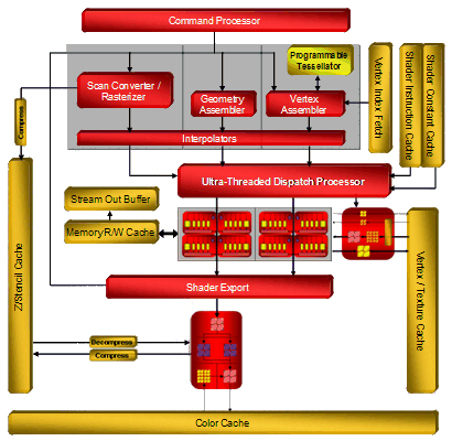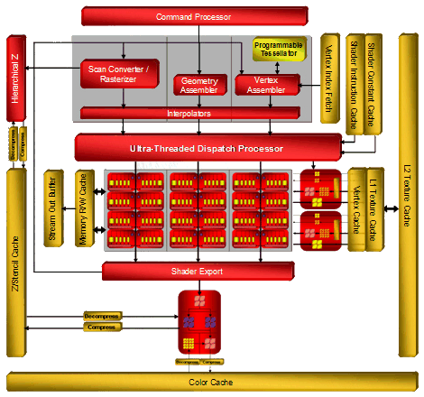 Схема нового чипа RV670 абсолютно идентична схеме R600. По сути, RV670 не отличается от R600 ничем, количество всех блоков (ALU, ROP, TMU) у него такое же. Единственное ухудшающее характеристики отличие нового mid-end чипа в том, что у него нет поддержки 512-битной шины, она «всего лишь» 256-битная, но всё остальное, написанное в том материале, относится к нему полностью.