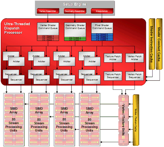 - Унифицированная архитектура с массивом общих процессоров для потоковой обработки вершин и пикселей, а также других видов данных