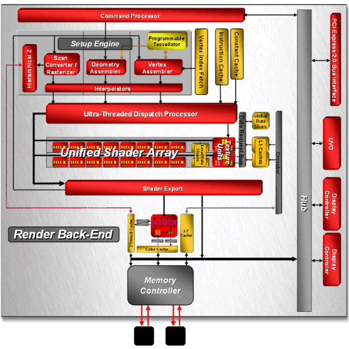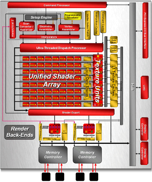 Как мы уже сказали, каждое из 10 ядер SIMD содержит по 16 суперскалярных потоковых процессоров (или 80 скалярных) и 16 килобайт локальной памяти для хранения данных и имеет собственный блок управления потоками. Также, в отличие от R6x0 и RV670, блоки TMU «привязаны» к SIMD, каждый из них имеет по четыре выделенных текстурных модуля и свой L1 текстурный кэш. SIMD ядра могут обмениваться друг с другом информацией при помощи 16 килобайт глобальной памяти. Как видите, мощность текстурников в новом чипе промасштабирована вместе с числом шейдерных процессоров, и соотношение между ALU и TMU равно 4:1.