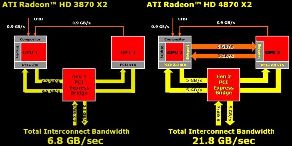 Рассмотрим схему соединений между чипами и системной платой, представленную компанией AMD. На ней сравниваются HD 3870 X2 и HD 4870 X2: