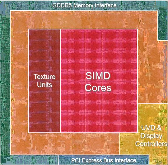 Поэтому было решено ускорить чип, добившись его работы на повышенных частотах. Инженеры компании переработали структуру RV770, переделав внутренние цепи и выводы чипа. А по периметру GPU был добавлен так называемый decap ring из фильтрующих (блокировочных) конденсаторов, которые помогают разделять сигналы, снижая шумы от соседних цепей. Эти изменения и повлекли небольшое увеличение количества транзисторов, в большей степени оказав влияние на увеличившуюся площадь ядра.