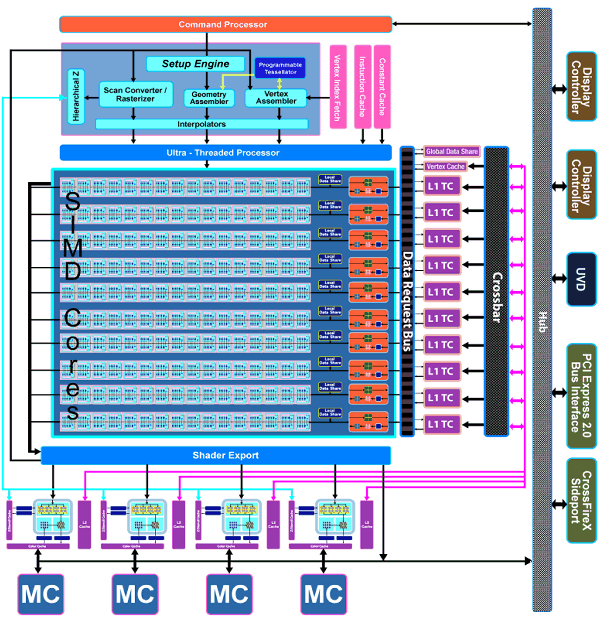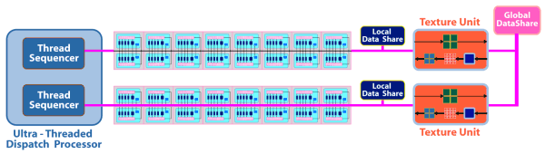 А вот блоки текстурирования изменились очень сильно, теперь они привязаны к SIMD, а их эффективность значительно улучшена. Проектировщики убрали выделенный пул TMU, известный по предыдущим поколениям чипов, реализовав решение, очень похожее на то, что мы видим у NVIDIA, с блоками TMU, включенными в состав SIMD ядер.