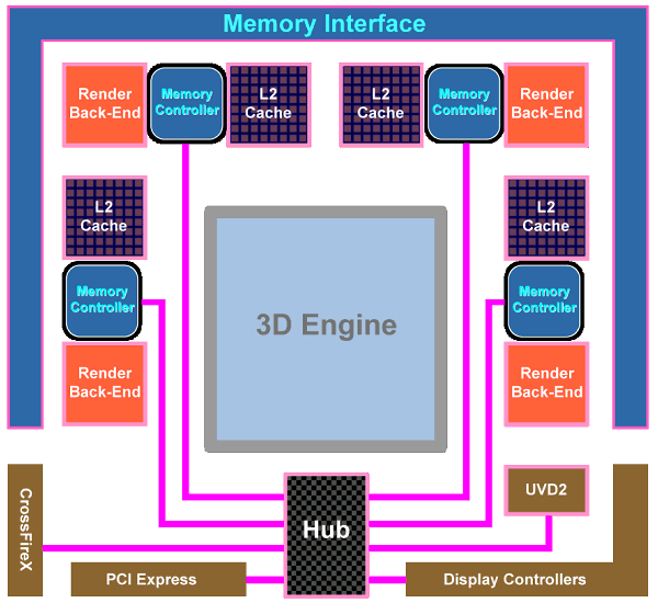 - Две 256-битные шины памяти, по четыре контроллера шириной по 64 бита с поддержкой типов памяти GDDR3 и GDDR5