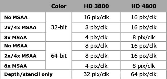 Была убрана возможность выборок без фильтрации, которая применялась ранее отдельно для вершинных данных. В новом чипе и тексели и вершины выбираются одними и теми же блоками, что также аналогично решению в G8x и далее. С другой стороны, каждый из 40 блоков текстурирования в RV770 стал несколько слабее, чем каждый из 16-ти в RV670, но увеличенное их количество, вместе с повышенными частотами, должно дать приличный прирост скорости текстурирования.