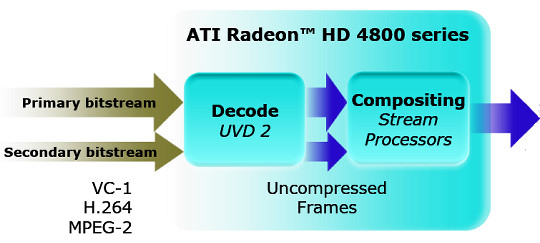 Технология ATI Avivo в серии Radeon HD 4000 включает в себя высококачественное масштабирование видеоданных из низкого разрешения (например, DVD) в более высокие HD (720p, 1080p). Таким образом, стандартные DVD с разрешением 720x480 или 720x576 при выводе на HD устройства вывода с разрешением 1920x1080 или 1920x1200 с ATI Avivo HD масштабированием обеспечат лучшее качество, чем с обычно применяемым программным масштабированием плееров. Вот пример, который приводит в презентациях компания AMD: