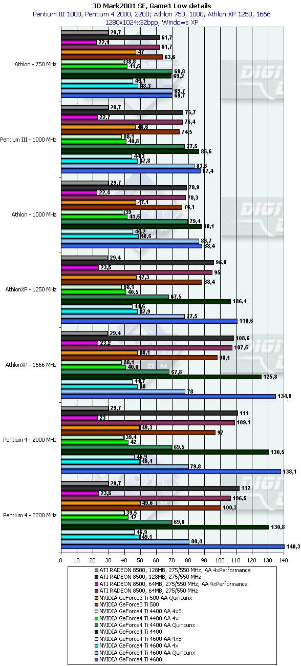 - Обзор ASUS V8440 и V8460 на базе NVIDIA GeForce4 Ti 4400 и 4600 - исследование зависимости производительности от частоты центрального процессора на примерах Intel Pentium III 1000, Pentium 4 2000, 2200 MHz, AMD Athlon 750, 1000 MHz, Athlon XP 1250, 1666 MHz (на базе 3DMark2001 SE).