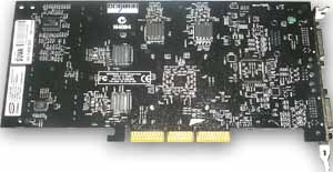 Разумеется, мы можем видеть и традиционную уже окраску PCB — черного цвета. Справа видим фирменные серебрянные (наверно все же платиновые :-) буквы, из которых сложены названия карт. Суффиксы DVI и SE выполнены в виде наклеек. Насчет "DVI" тут все понятно: до выхода рассматриваемой карты на базе Ti 4400 в продаже была плата без DVI (ну и без "двуголовости" конечно, с точки зрения технологии nView). А вот суффикс SE у карты на базе Ti 4600 означает наличие VIVO у данной модели. Карта без SE поставляется с простым TV-out.
