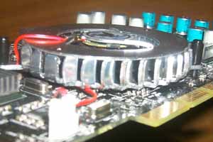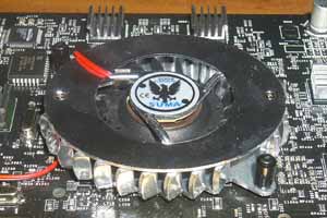 Кроме всего перечисленного мы сразу замечаем охлаждающее устройство, которое уже могли видеть в обзоре карт от ASUSTeK. Обратим еще раз внимание на несколько необычный вид. Во-первых, перед нами кулер, у которого вентилятор представляет собой почти турбину — такого еще не было. Во-вторых, размеры радиатора достаточно велики. Поэтому кулер весьма тяжелый, хотя и сделан из алюминиевого сплава.