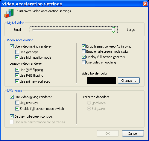 Все настройки драйверов и программного обеспечения оставлены по умолчанию. Основные настройки производительности Windows Media Player 10, использованные при тестировании, приведены на скриншоте: