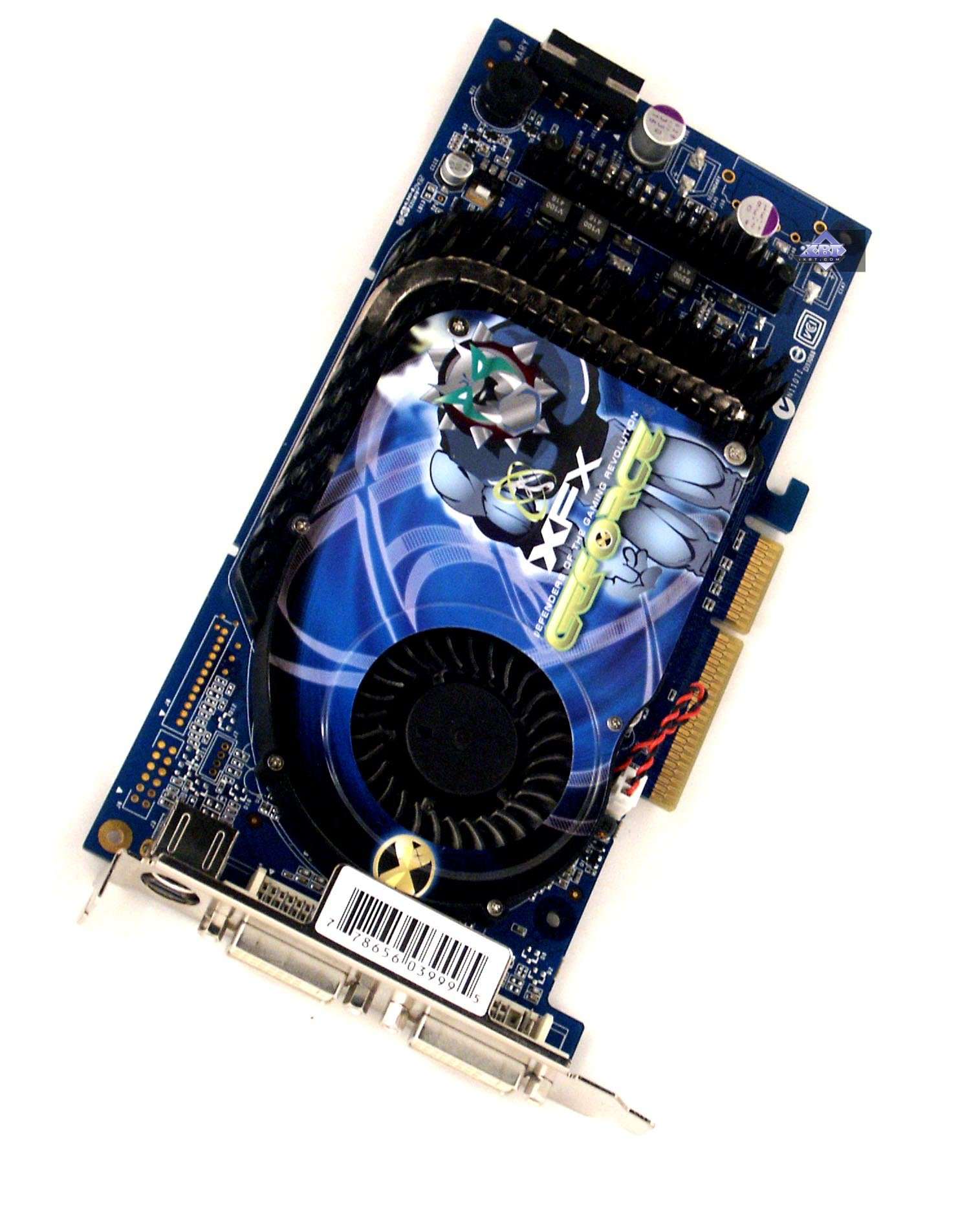 - XFX GeForce 6800GT AGP 256MB — такая же копия reference. Плюс от этого состоит в том, что сейчас распространено очень много подобных плат с громоздкими двухслотовыми кулерами. А тут узкий эталонный кулер. Разгон обычный для таких карт — 430/1180 МГц (хотя повторю, что разгон — дело конкретного экземпляра!). Качество 2D в 1600х1200 при 85 Гц — отлично.