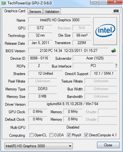 Acer Aspire Timeline Ultra M3 полностью поддерживает технологию Optimus, и благодаря использованию энергоэффективных CPU и GPU с поддержкой этой технологии, ультрабук способен обеспечить длительное время автономной работы — до восьми часов в автономном режиме с небольшой нагрузкой на GPU, по данным компании Acer. Посмотрим, что о характеристиках двух графических ядер нашего тестового ноутбука Acer может рассказать тестовая утилита GPU-Z: